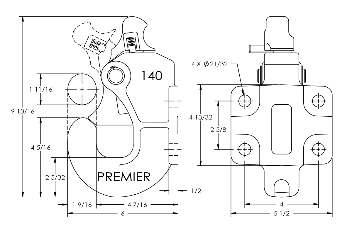 Premier Manufacturing’s 140 coupling has been in use by light and medium-duty users for many years. Easy to operate, its strike-resistant latching and popular mounting pattern make the 140 ideal for numerous industries and applications. With a maximum gross trailer weight of 30,000 lbs. and 2,250 lbs. latch capacity, the 140 is perfect for your everyday hauling needs.