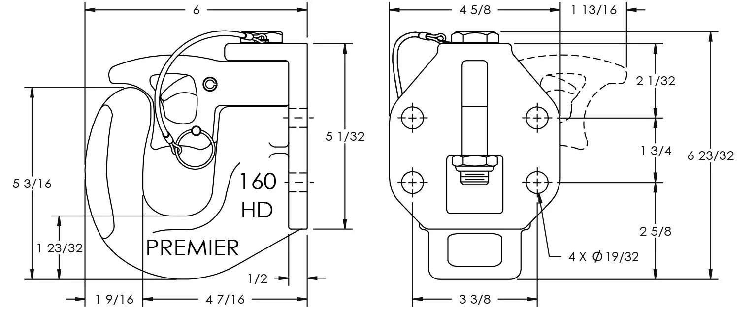 With the same unique latching as our 150 & 160 Couplings, the 160HD offers a compact profile for tight places. It is ideal for dolly haul back and other light-to-medium duty applications. The 160HD uses 9.16″ mounting holes, whereas the 160 uses 1/2′ mounting holes. With a maximum gross trailer weight of 40,000 lbs. and 5,000 lbs. latch capacity, Premier’s 160HD is perfect for your everyday trucking needs. Be sure to check out the Accessory & Replacement Parts to get the correct bolt kit for installation.