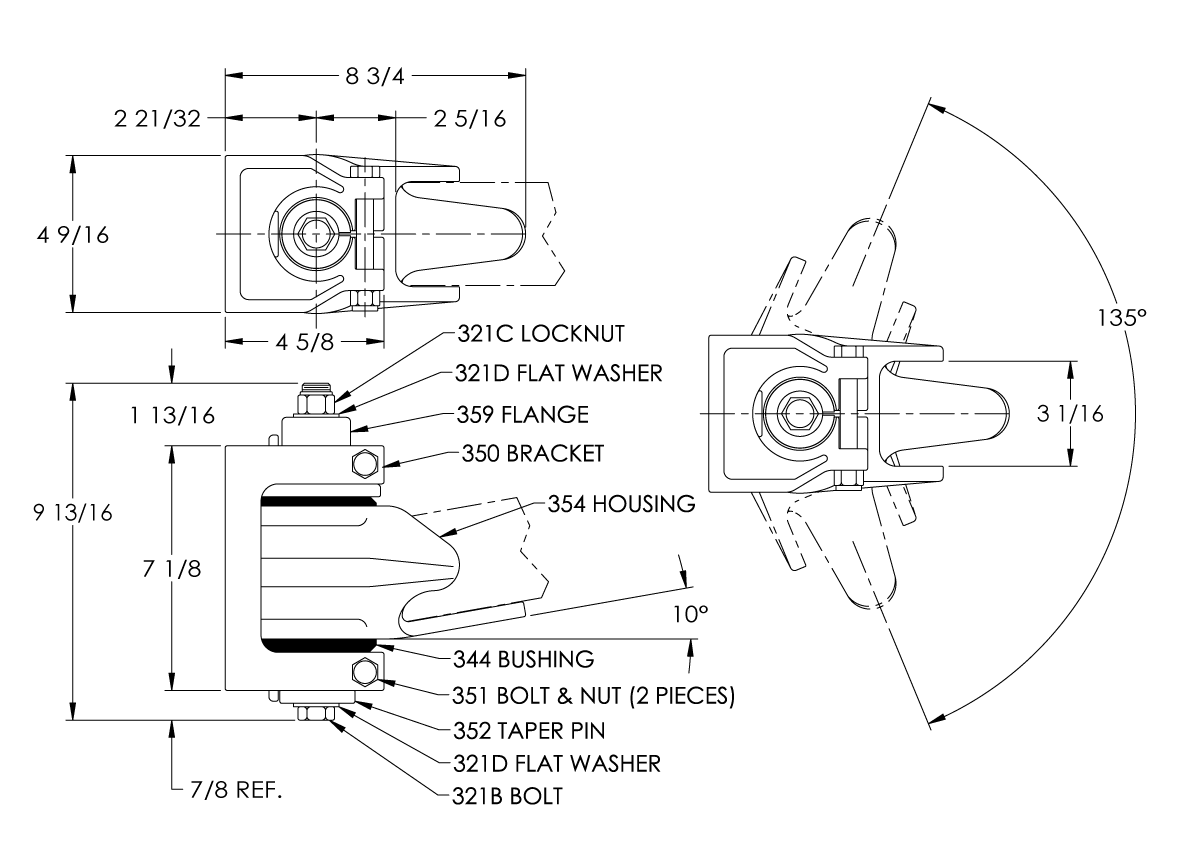 320A10000944 PAIR Hinges, Poly Bushings321B Bolt, 321C Locknut, 321D Flat Washer (2), 344A Bushing, 350 Bracket, 351 Bolt/Nut (2), 352 Taper Pin, 354 Housing, 359 Flange