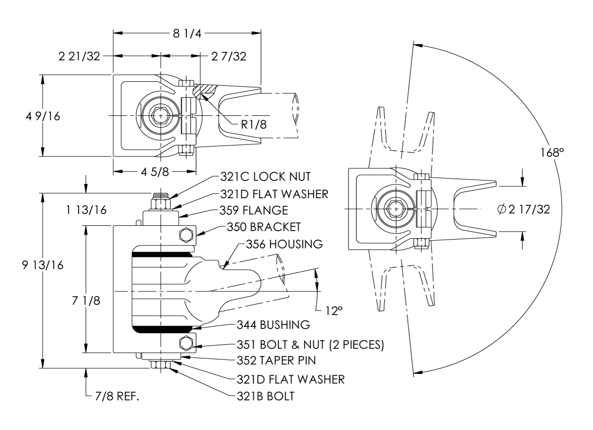 330A10000950 PAIR Hinges, Poly Bushings321B Bolt, 321C Locknut, 321D Flat Washer (2), 344A Bushing, 350 Bracket, 351 Bolt/Nut (2), 352 Taper Pin, 356 Housing, 359 Flange