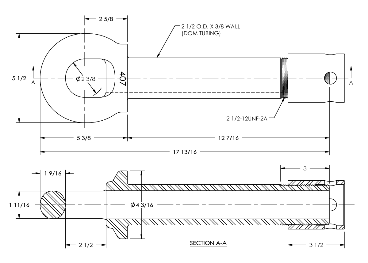 | Drawbar Eye Dimensions | 2 3/8" ID, Shaft 2 1/2" OD x 3/8" wall DOM x 12 7/16" L |